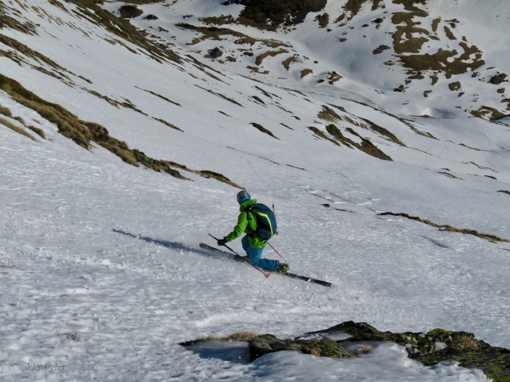 Deshacemos nuestros pasos por la gran pala. A nuestros pies, unos 700 metros de desnivel para disfrutar al máximo. Lo más complicado de este descenso (en las condiciones en la que lo encontramos) es buscar los pasos de nieve, sobre todo en la parte final del descenso.